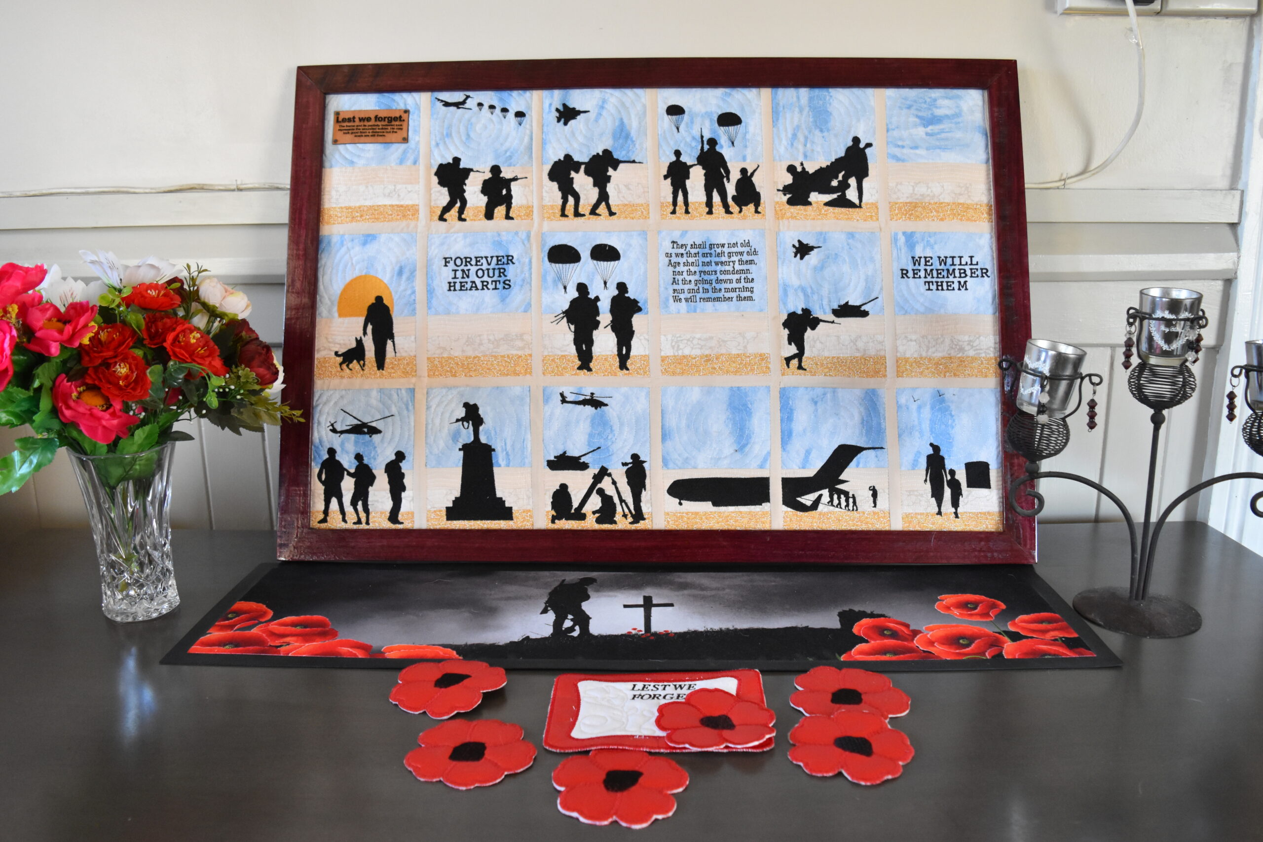 The quilt is made by Xaria who gave it to our friend. He is ex-army. I have framed it with Purple Heart and I have purposely left it with imperfections and represents the wounded solider… and as it says on the small plaque;